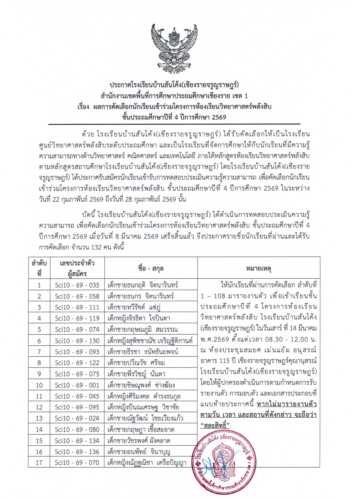 ประกาศผลการคัดเลือกนักเรียนเข้าร่วมโครงการห้องเรียนวิทยาศาสตร์พลังสิบ ชั้นประถมศึกษาปีที่ 4 ประจำปีการศึกษา 2569 🤍❤️