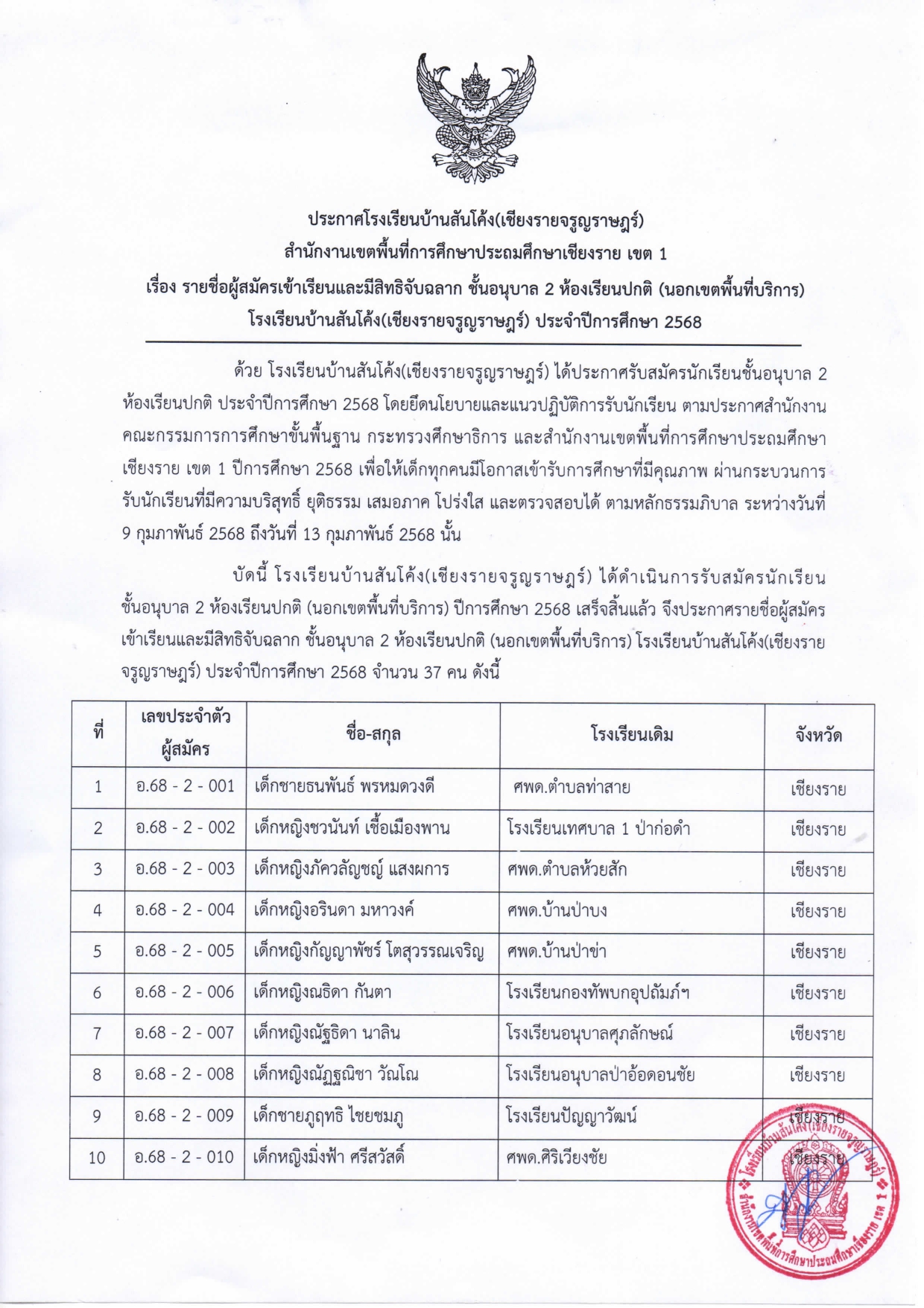 ประกาศรายชื่อผู้สมัครเข้าเรียนและมีสิทธิจับฉลาก ชั้นอนุบาล 2 ห้องเรียนปกติ (นอกเขตพื้นที่บริการ) ปีการศึกษา 2568 14 ก.พ. 2568webmasterประกาศ